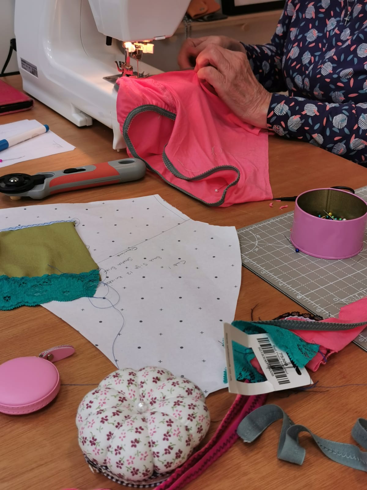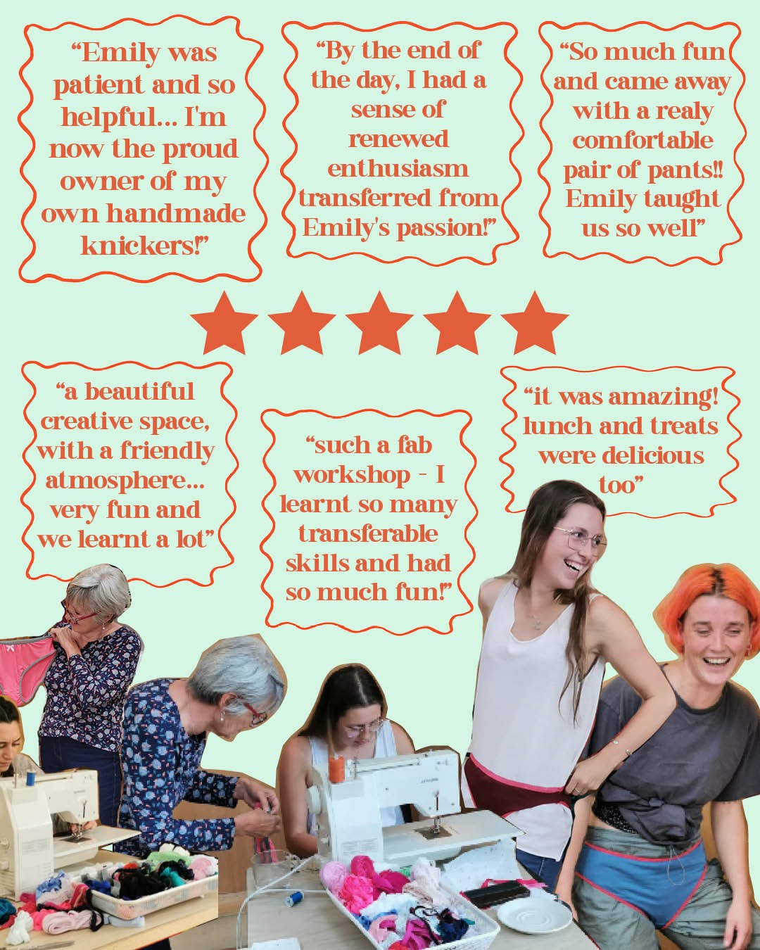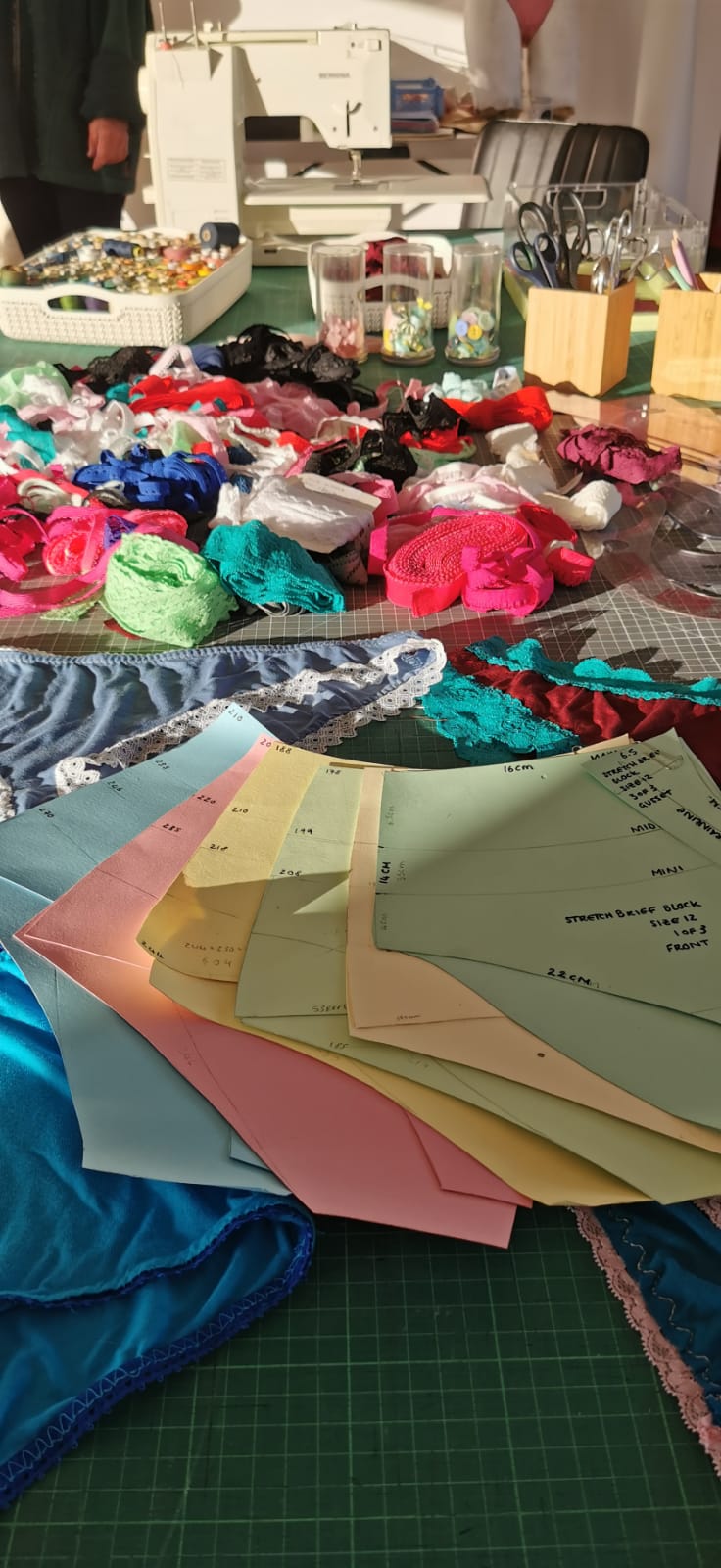 I had such a great day at Emily’s workshop! We enjoyed a beautiful creative space, with a friendly atmosphere and warm encouraging environment. I have used sewing machines before for one-off projects, but Emily’s thorough explanation of each stage ensured that everyone knew what they were doing. It was very fun and we learnt a lot about different types of lace and how to use them, thanks to Emily’s extensive knowledge. The lunch served by Sian was delicious. You’ll never buy knickers again!