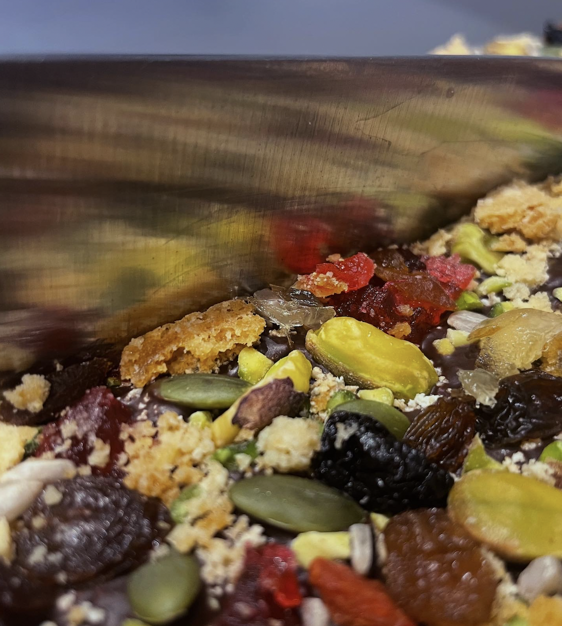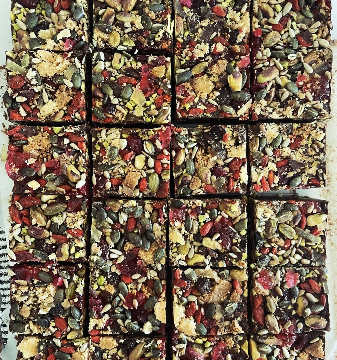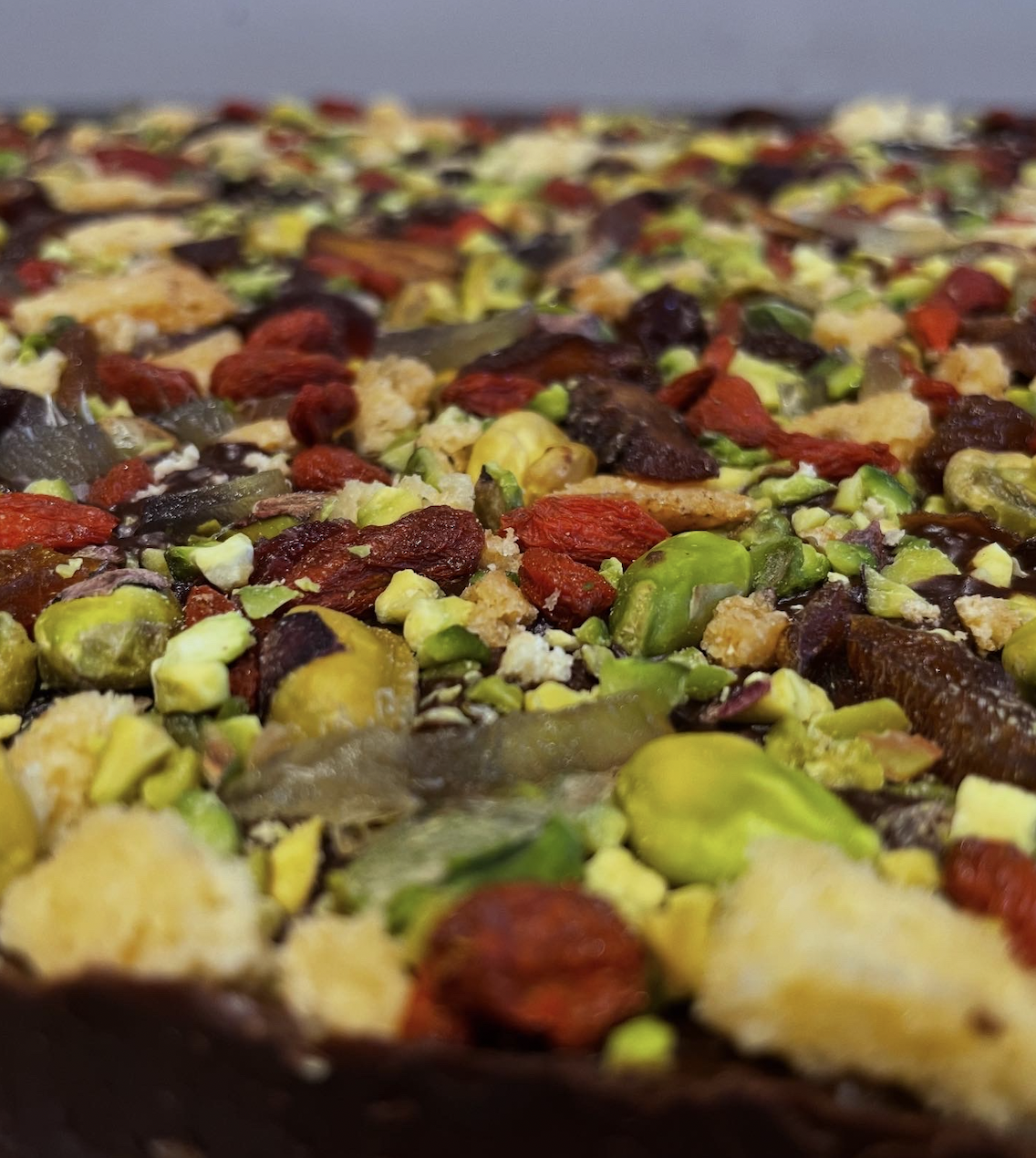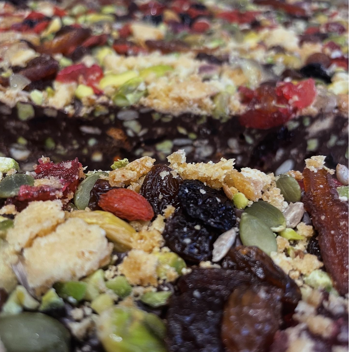 Cooking Chocolate (Cocoa Mass, Sugar, Cocoa Butter), Tahini (SESAME), Homemade Biscuit (Gluten-Free Flour, Vegan Butter, Caster Sugar, Stem Ginger), Pistachios (NUTS), Stem Ginger, Dried Fruit (Unsulphured Apricots, Naturally Dried Cherries, Sultanas, Goji Berries), Toasted Seeds (Pumpkin Seeds, Sunflower Seeds).
