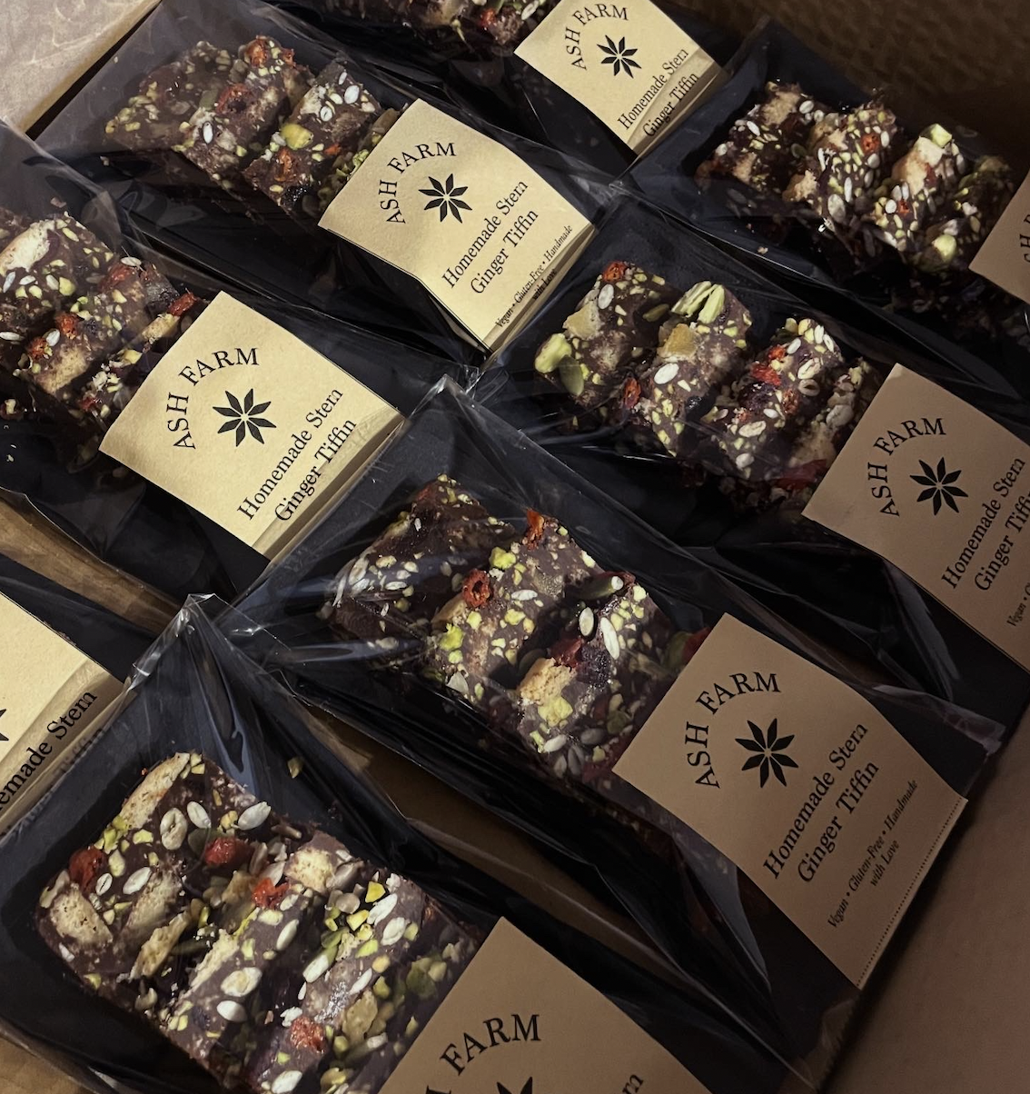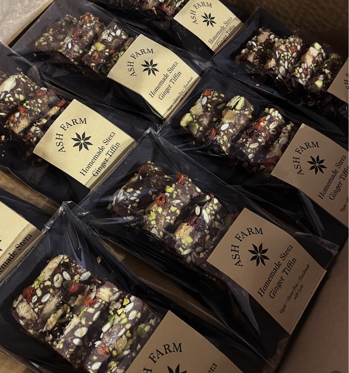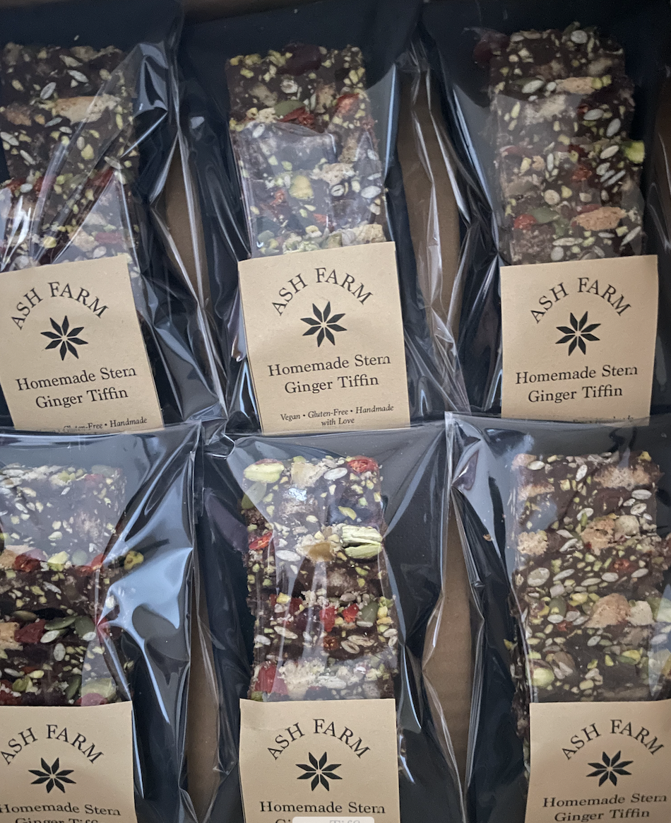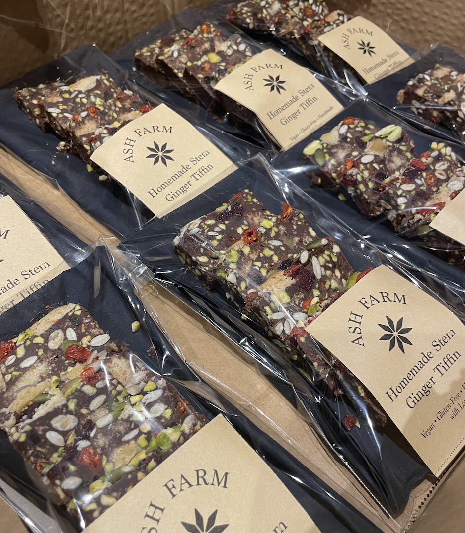 Indulge in our rich, chewy Stem Ginger Tiffin, handcrafted in small batches at Ash Farm. Every batch includes our homemade biscuit, specially made to ensure it is vegan and gluten-free, paired with decadent chocolate, tangy stem ginger, crunchy pistachios, and a medley of naturally dried fruits and toasted seeds. We also use predominantly organic ingredients, including unsulphured apricots and naturally dried cherries, for a pure, wholesome taste.