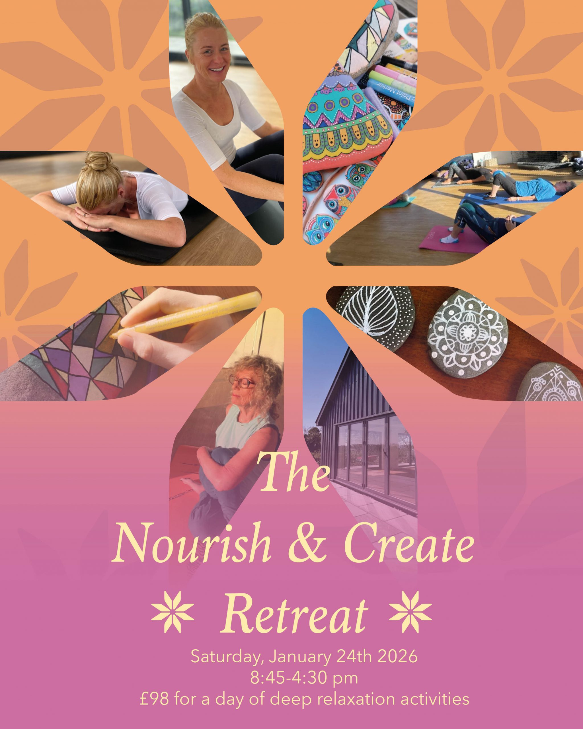 1.5 hr Pilates & Meditation | 1 hr Food demo | 1.5 hr Yoga and Meditation | 1 hr lunch | 30 mins walk | 2 hrs sound bath | herbal tea and a small sweet treat to finish
